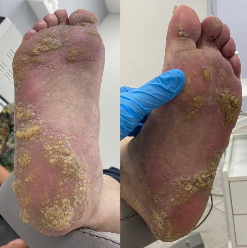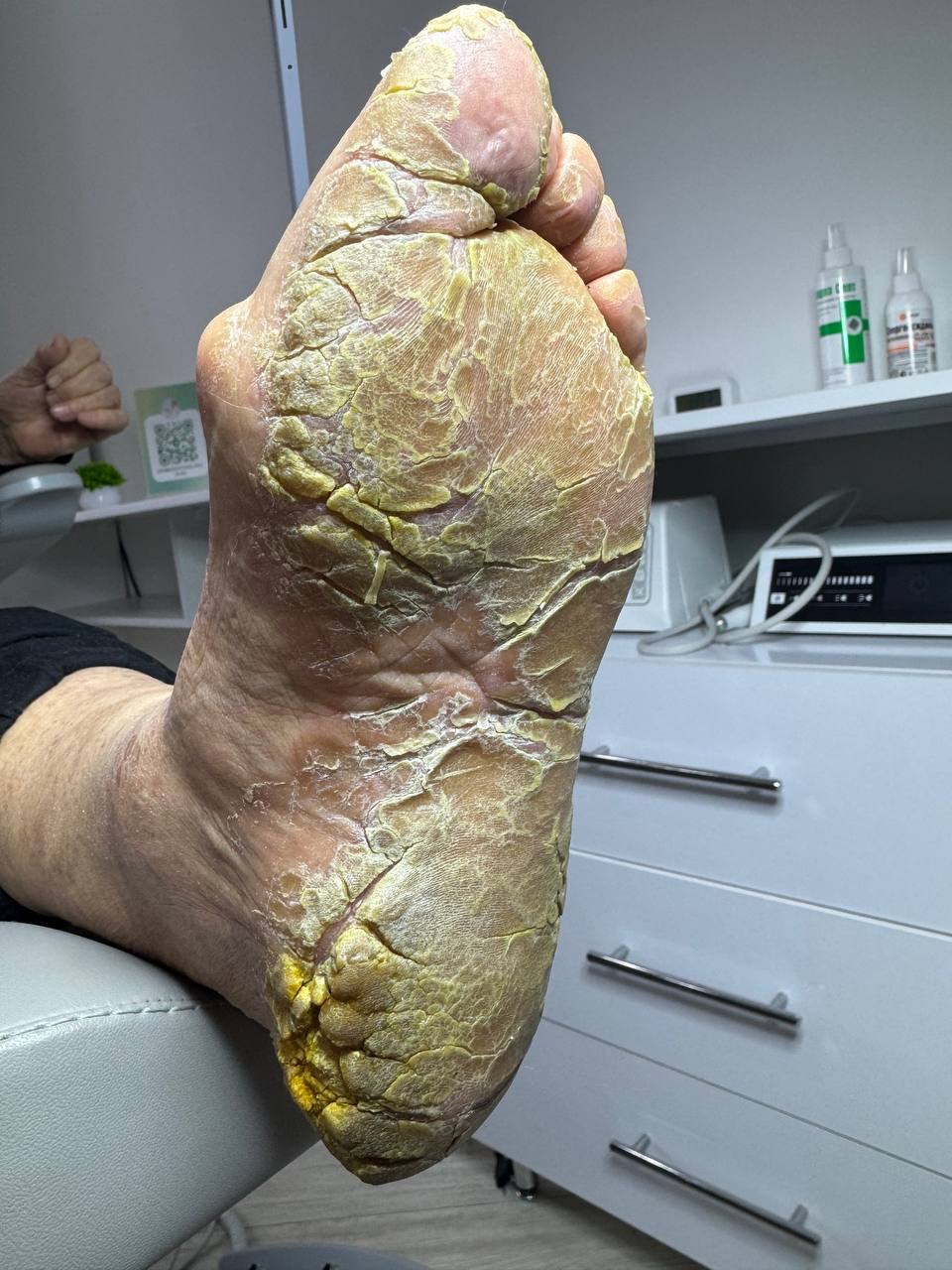 Подологическая обработка включает глубокую обработку кожи стоп, устранение натоптышей, мозолей, ногтевых пластин без грибковой инфекции.